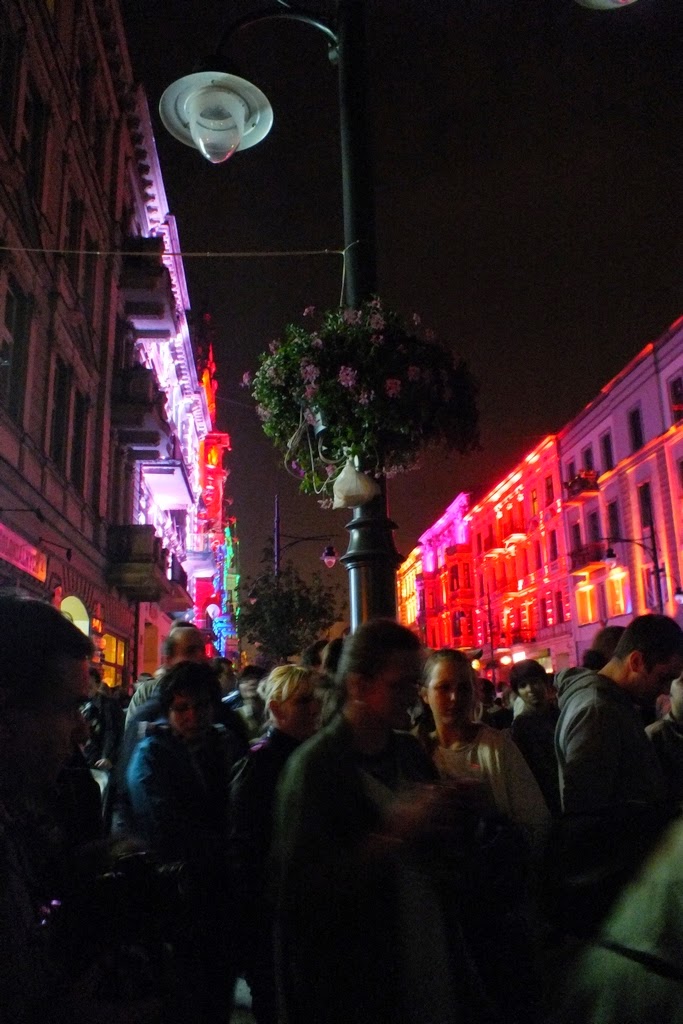 Ten pokaz zdecydowanie wynagrodził wiele, jednak nie zatarł całkowicie nieprzyjemnego wrażenia, towarzyszącego mi przez cały "spacer" wzdłuż Piotrkowskiej. Wyeksponowane światłem kamienice, wyglądały bajecznie, ożywiały ulicę. Gdyby pozostawić je tak na dłuższy okres, mogłyby się stać niezwykle atrakcyjne dla turystów. Szkoda tylko, że było ich tak mało i skupiono się tylko na odnowionych budynkach. Przez odpowiednią zabawę oświetleniem można nie tylko wyeksponować piękno zabytku, ale i mrok zaniedbania, co mogłoby stanowić ciekawy kontrast i wyzwanie dla artystów. Nie mogłam oprzeć się wrażeniu, iż mimo włożonej pracy, cały festiwal został potraktowany zbyt po macoszemu. Wiele można by zarzucić organizatorom, ale jeszcze więcej samym uczestnikom. Wystarczyło naprawdę niewiele wyobraźni, by domyślić się ile osób przyciągnie taka impreza, więc czy naprawdę trzeba ciągnąć na nią psa, który ledwo sięga do połowy łydki i ciągle skomle, ponieważ jest nieustanie deptany? Niemowlaki w wózkach naprawdę wiele zobaczą ze swych spacerówek, dodatkowo jeszcze osłoniętych przed wiatrem i innymi ludźmi. Chyba, że taka konstrukcja ma służyć za taran, wówczas faktycznie ma to swoje praktyczne zastosowanie. Jednak najgorsze wrażenie pozostawiły osoby wściekające się na innych, za to że w ogóle pojawili się na festiwalu i robią tłum! Absolutnym hitem była kobieta donośnym głosem informująca o swojej domniemanej słabości i problemach żołądkowych oraz grożąca puszczeniem barwnego pawia, używając do tego nieco mnie obrazowych słów.