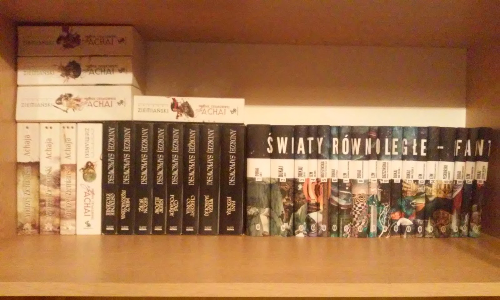 Moja ściana książkowa składa się, na obecną chwilę z dwudziestu czterech tytułów i nie liczę tu kolejnych osiemnastu tomów kolekcji Światy Równoległe, w którą zaopatruję się odkąd zaczęłam zarabiać (co cudownie zbiegło się w czasie z premierą cyklu). Na strony nawet nie próbuję tego przeliczać, widząc w niej trzy ponad tysiąc stronicowe kobyłki (dla zainteresowanych Słowa światłości, Rybak znad Morza Wewnętrznego, Miecz i Kwiaty). Biorąc pod uwagę ile czytają Polacy, wrabiam średnią krajową chyba za cały blok. Słów "Nie mam co czytać" nie powinnam wypowiadać przez najbliższe dwa lata... Jak do tego doszło i kto jest za to odpowiedzialny? No cóż... Tylko ja.