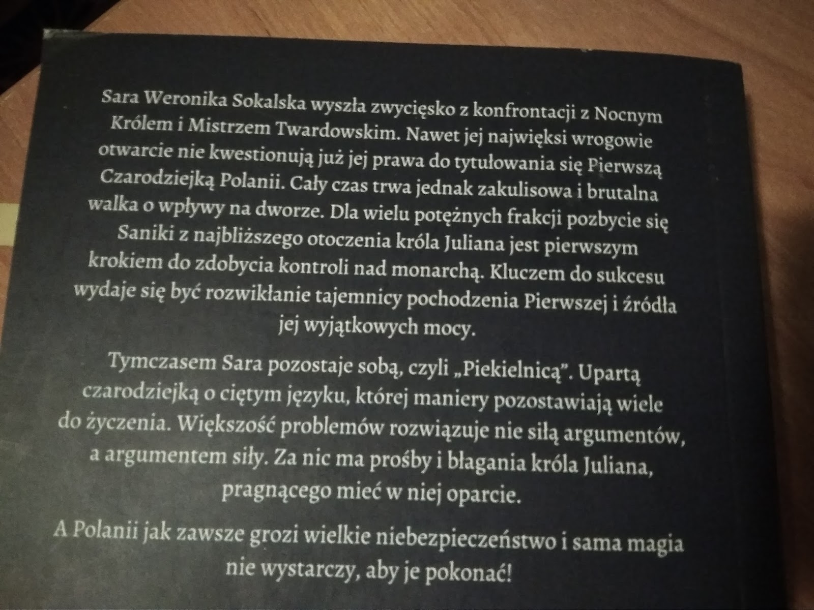 to powieść niezła, ale nieoszlifowana. Pojawiające się w niej błędy przeszkadzają w odbiorze i umniejszają jej wartość. Nie zmienia to jednak faktu, że niezwykle ciekawa, alternatywna rzeczywistość Krakowa została przytłoczona przez niesamowicie dominujący charakter głównej bohaterki, który do najprzyjemniejszych nie należy. Choć trzeba przyznać, że jest w tym duża konsekwencja twórcza, gdyż Sanika od samego początku nie pozostawia nam złudzeń, co do samej siebie. Smuci mnie nieco brak wyrazistości innych bohaterów, a w szczególności Lidii - Białej Czarodziejki, która mogłaby stanowić cudowną przeciwwagę dla Sary, gdyby tylko miała fabularnie większe znaczenie. Ogólnie rzecz ujmując całość uważam za powieść w porządku, nawet z lekkim plusem, ale o niewykorzystanym potencjale. A szkoda.