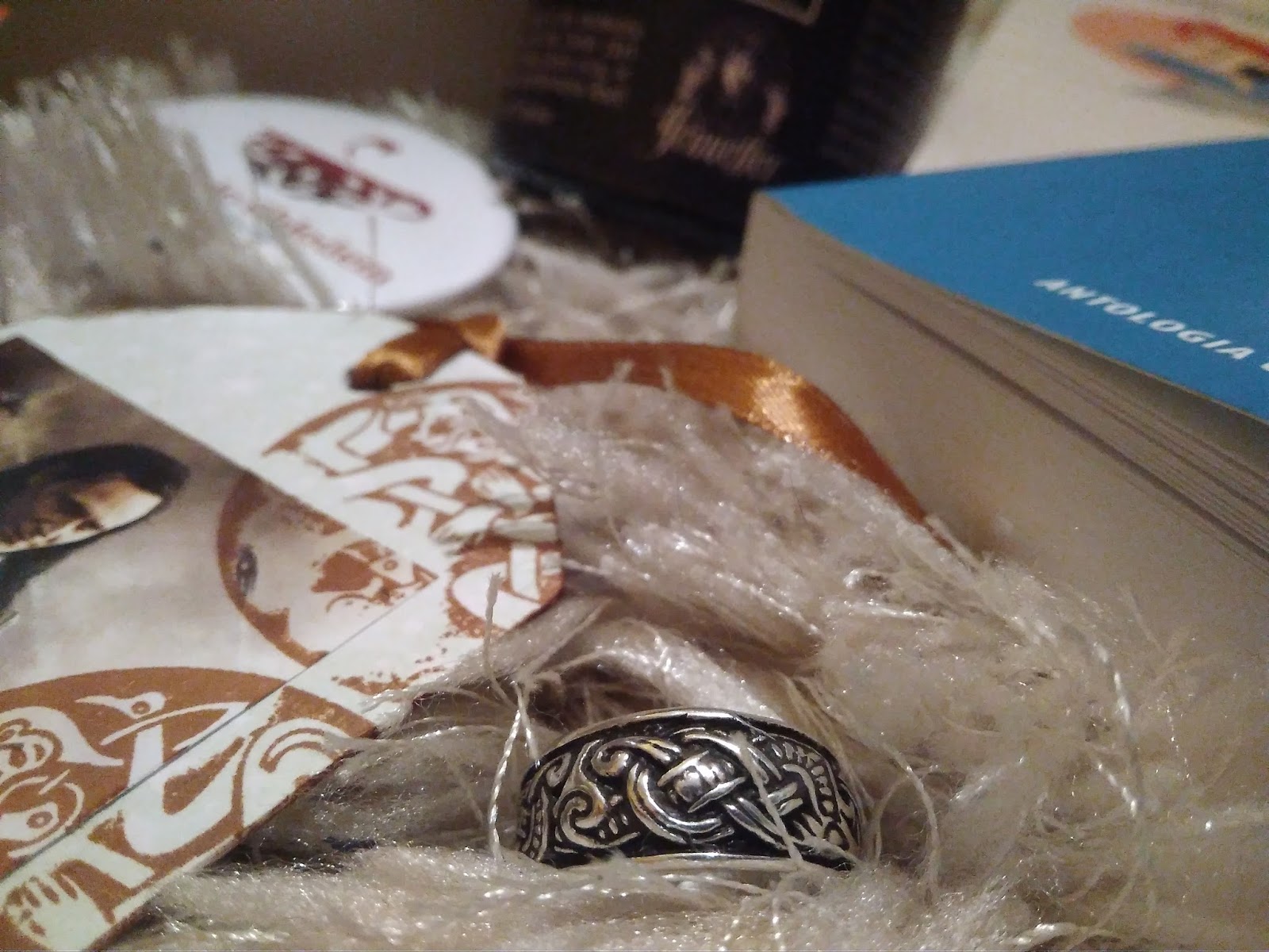 Co nie znaczy, że na Targach nie było niezwykłych stoisk, prowadzonych przez magicznych, pełnych energii ludzi. Na początek Zmora Shop, którego opiekunowie uwijali się jak w ukropie, żeby zaspokoić apetyty fantastycznych konsumentów. Oczywiście ich domeną jest ręcznie wykonana biżuteria, a także ubrania czy plakaty. Oprócz cudownie sympatycznej obsługi, zachwyciłam się jakością ich asortymentu. Srebrna obrączka, którą u nich nabyłam może do najtańszych nie należała, ale doskonale leżała na moim palcu i z chwili na chwilę misterny wzór na niej podobał mi się coraz bardziej. I nie ma co ukrywać, że zachwycam się nią niemal permanentnie. Żałowałam też, że niesłabnące tłumy nie pozwalały mi na dłuższą rozmowę z obsługą, bo te, które udało mi się przeprowadzić były nad wyraz przyjemne. Oczywiście nie mogło też zabraknąć Magdy Kozłowskiej tworzącej Fantastyczne kartki Cathii, czyli najbardziej geekowo-fandomowe pocztówki, zakładki i notesiki jakie człowiek mógł sobie wyobrazić. Bo jak tu się nie zachwycać nordyckimi bogami pełniącymi funkcję zakładek i rozmowami o niekończącej się ilości książek. Smuciło mnie tylko umiejscowienie tego stoiska w wąskim gardle przejścia, które już po godzinie trzynastej było permanentnie zakorkowane.