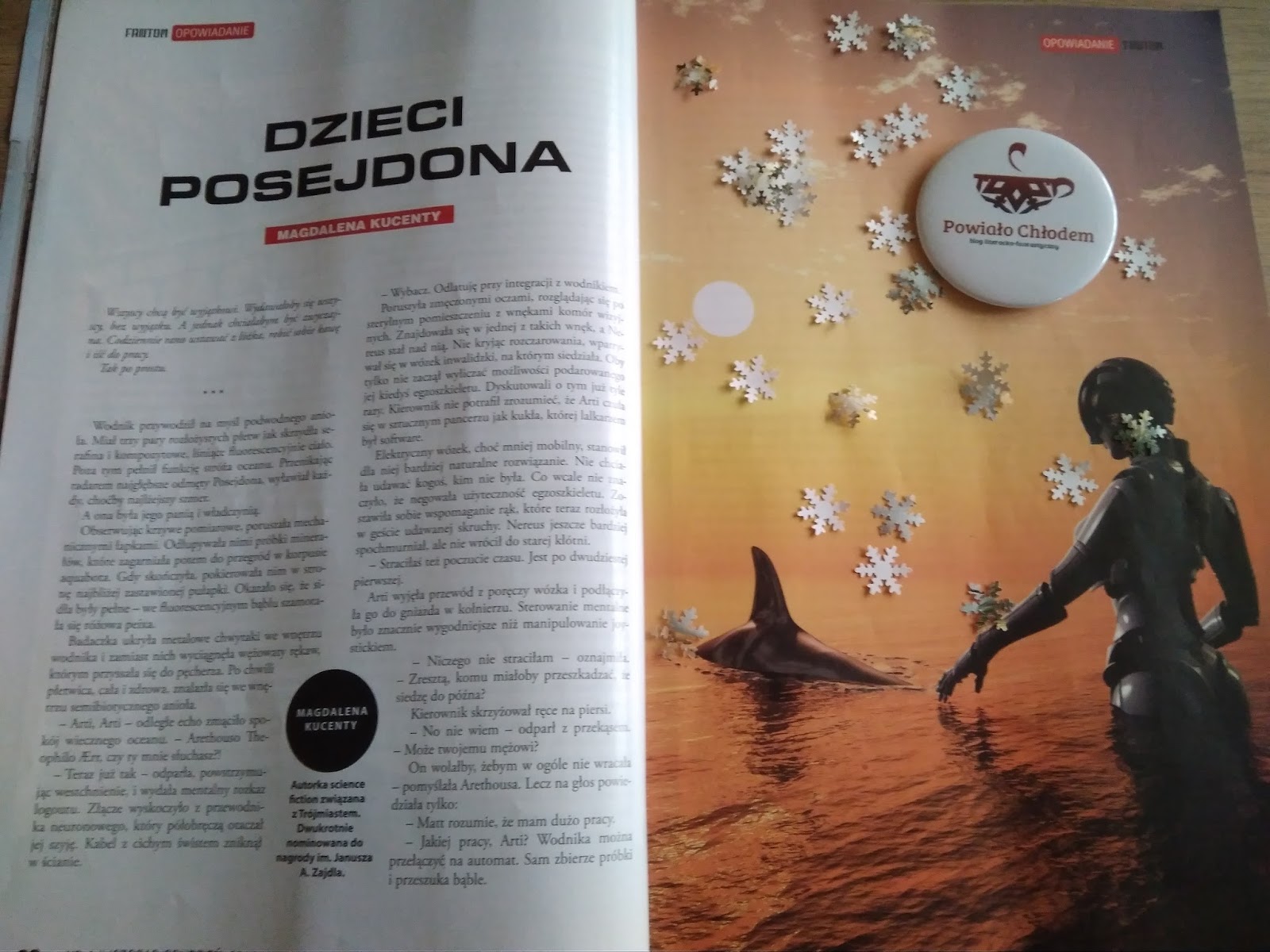 jest opowiadanie Magdaleny Kucenty “Dzieci Posejdona”. W trakcie czytania bardzo intensywnie dało się odczuć wyobcowanie, frustracje i gorycz głównej bohaterki skazanej na wieczne współczucie. Jakby tego było mało, cały ten dramat psychologiczny rozgrywa się w obcej, nie do końca przyjaznej scenerii - planety pokrytej niemal wyłącznie wielkim oceanem. Naprawdę mocny, do końca trzymający w napięciu tekst, który zdecydowanie przypadł mi do gustu.