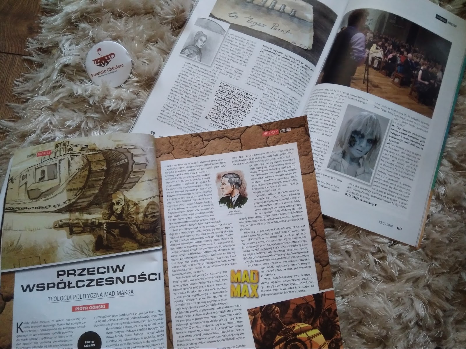 Niezwykle pozytywnie zaskoczyła mnie publicystyka tego numeru. Nie dość, że w większości doskonale wyczerpała temat tego konkretnego wydania, to jeszcze stanowiła skarb nicę wiedzy i zaczątek do bogatych, merytorycznych rozważań. Marta Kładź-Kocot bardzo zgrabnie wyłuszczyła czytelnikowi, dlaczego postapokalipsę jako taką możemy określić mianem współczesnego mitu. Z kolei Dominika Tarczoń mierzy się z definicją gatunku, ponieważ okazuje się, że nie jest ona tak oczywista, jak mogłoby się to wydawać. Z resztą fantastyka sama w sobie jest bardzo różnorodną i bogatą odmianą literacką. Największe wrażenie jednak wywarł na mnie artykuł Piotra Górskiego, w którym omawia on teologię polityczną Mad Maxa. Niezwykle konsekwentnie i przekonująco przedstawia swoje argumenty, stosując przy tym przyjemny, czytliwy język, co sprawia, że nie dość, iż wszystko rozumiemy, to jeszcze trudno nam się z autorem nie zgodzić.