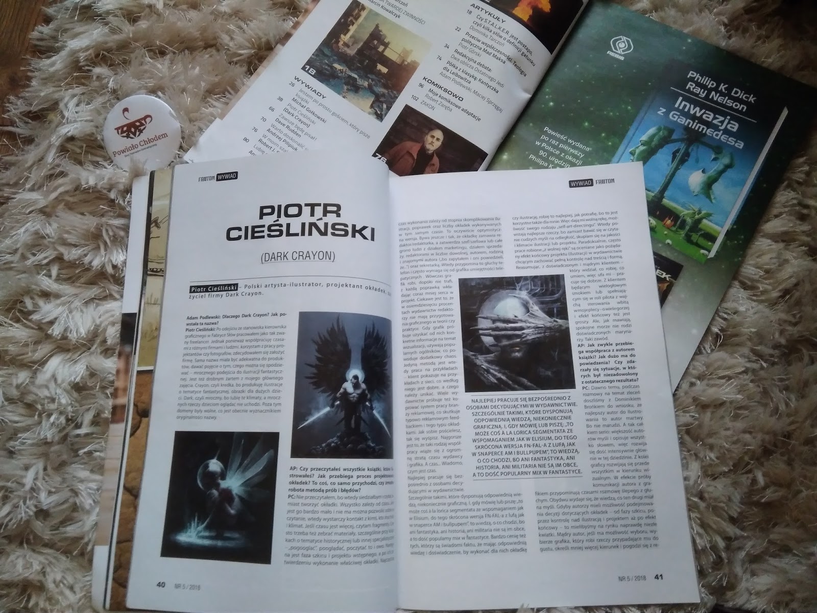 Wśród wywiadów najbardziej ucieszył mnie ten przeprowadzony z Piotrem Cieślińskim - założycielem firmy Dark Crayon. Oglądając okładki książek bez trudu mogłabym powiedzieć, które z nich projektował ten konkretny autor, zupełnie tak jak kiedyś rozpoznawałam grafiki Johna Avona na kartach do MTG, to samego grafika nie poznałabym na ulicy. Co prawda to się akurat nie zmieni, bo zamiast zdjęcia pana Piotra mamy jego prace z tak dobrze znanych fantastom okładek (co jest zrozumiałe, bo Dark Crayon to już nie jedna osoba a cały zespół), ale miło jest choć nieznacznie poznać człowieka, który za nimi stoi. Niesamowitą ilość pozytywnych treści przekazał mi także wywiad z Davem Rudenem. I choć znam go raczej z reklam jego książek niż z czytelniczych doświadczeń, to przyjemnie czytało się o jego pisarskich doświadczeniach. Było to niezwykle motywujące. Podobnie jak rozmowa z Andrzejem Pilipiukiem, ale akurat w przypadku Wielkiego Grafomana to niezależnie od miejsca i czasu, zawsze dobrze jest go posłuchać.