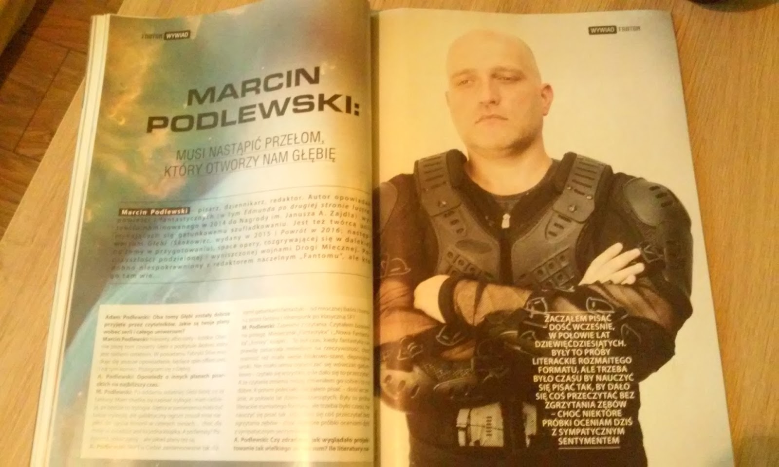 Na początku cieszy duży format i solidnie sklejone sto stron numeru. Z okładki wita nas jakże dobrze znany Jakub Wędrowycz i czytelny skrót tego, co możemy w magazynie znaleźć. Szybkie przekartkowanie ujawnia mocny, śliski papier i liczne, nieraz całostronicowe, kolorowe zdjęcia. Pierwsze wrażenie wypadło więc jak najbardziej na plus. A potem zaczęłam czytać. Na samym początku zaskoczyły mnie "Fantastyczne ciekawostki". O ile nie bardzo mogłam zrozumieć, po co znalazły się one w numerze, o tyle ich dowcip i lekkość, jakoś tak lepiej nastawiły mnie na dalsze czytanie. Potem nastąpiło bliższe zapoznanie z Andrzejem Pilipiukiem w postaci krótkiego wywiadu, choć nie na tyle odkrywczego, by odpowiedzi na cześć pytań mnie zaskoczyły. Dla odmiany opowiadania _"Gumofilc"autorstwa największego piewcy polskiej wsi od czasów Reymonta nie znałam (pewnie dlatego, że "Konan Destylator"_ jeszcze nie wpadł w moje łapska), ale też specjalnie nie mnie ono nie zachwyciło. Jednakowoż jest to bardziej wynik nie wpasowania w moje gusta, niż czegoś innego.