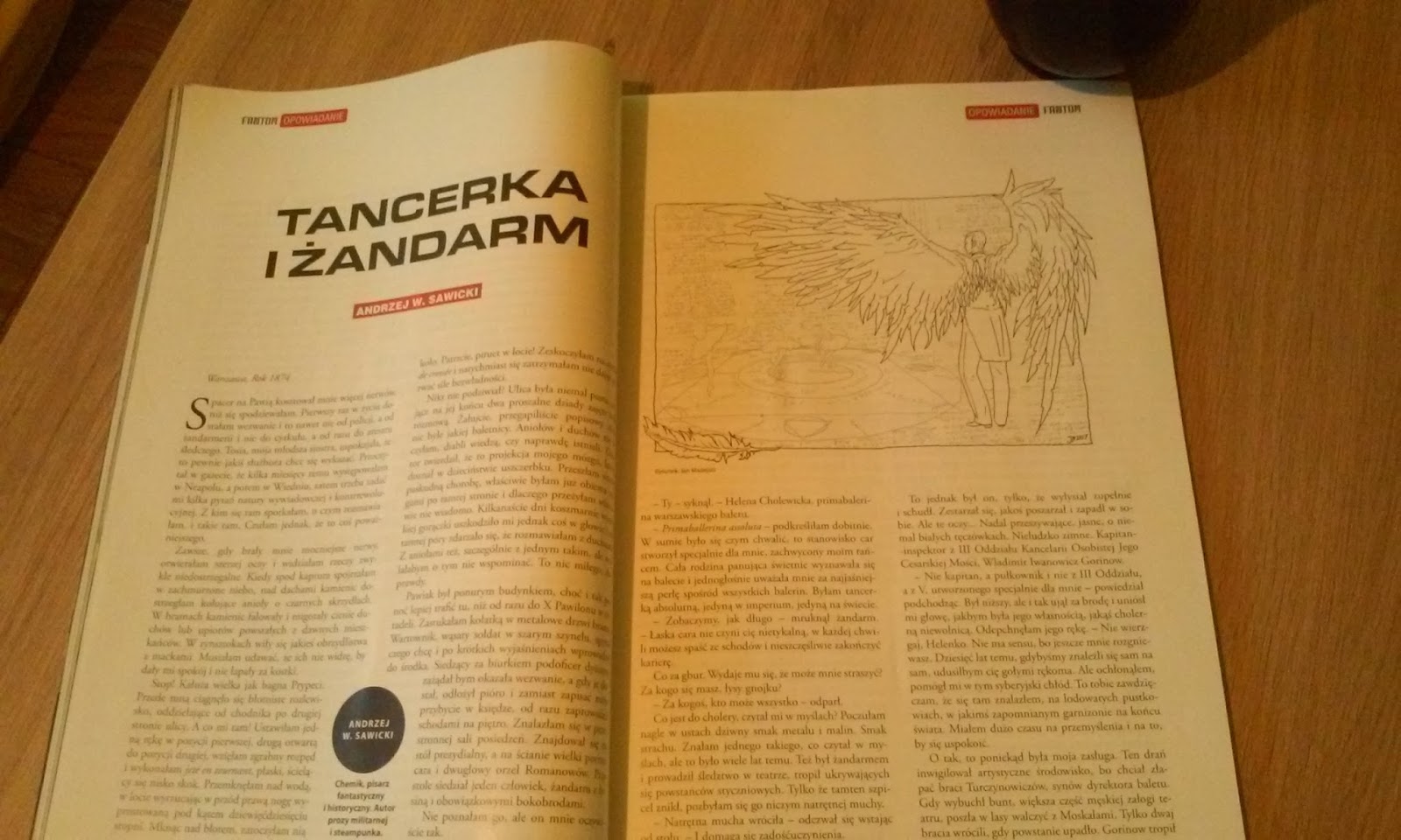 W przypadku kolejnego tekstu - "Tancerka i żandarm" Andrzeja Sawickiego - niezwykle przypadła mi do gustu koncepcja głównej bohaterki. Pomysł na primabalerinę, która swoim tańcem potrafi otwierać się na świat duchów i przywoływać anioły? Do tego klimat carskiej Rosji i polski pod zaborami? Toż to ma niesamowity potencjał! Zdecydowanie przeczytałabym więcej przygód Heleny Cholewickiej. Ponadto wyjątkowo przypadła mi do gustu grafika Jana Madejskiego ilustrująca ten utwór. Natomiast "Lawilet" Anny Szumacher jest tekstem specyficznym, opowiadającym o pewnym aniele stróżu i jego podopiecznych. Chaotyczne przeskoki od jednego "ubezpieczonego" do drugiego z trudem pozwalają stwierdzić, że głównym bohaterem jest w zasadzie "boski opiekun", którego tak po prawdzie mało co poznajemy. Dlatego też decyzje jakie podejmuje w finale opowieści nie tyle zaskakują co peszą, przynajmniej mnie.