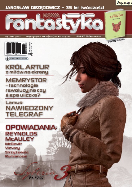 Mimo że w ostatnich tygodniach musiałam więcej czasu poświęcić pracy zawodowej, nowy dział bloga stopniowo się rozrasta. Już wkrótce oprócz Nowej Fantastyki, będziecie mogli znaleźć w nim najnowszy, jeśli dobrze liczę już ósmy, numer Smokopolitana, stopniowo coraz głośniej zapowiadany na TwarzoKsiążkowym profilu magazynu. Do tego z pewnością dojdzie Fantom, który swoją premierę ma mieć już na Pyrkonie (przyszły weekend jak pamiętam) i, z tego co mówią wydawcy, ma być dostępny w szerokiej sprzedaży z kioskami Ruch i Kolporterem łącznie, co osobiście z chęcią sprawdzę. Jednak zanim to nastąpi mam przed sobą majowy numer Nowej Fantastyki, który już od niedzieli jest do nabycia w kioskach. W numerze można jednak bez wątpienia znaleźć kilka rzeczy, z którymi warto się zapoznać.