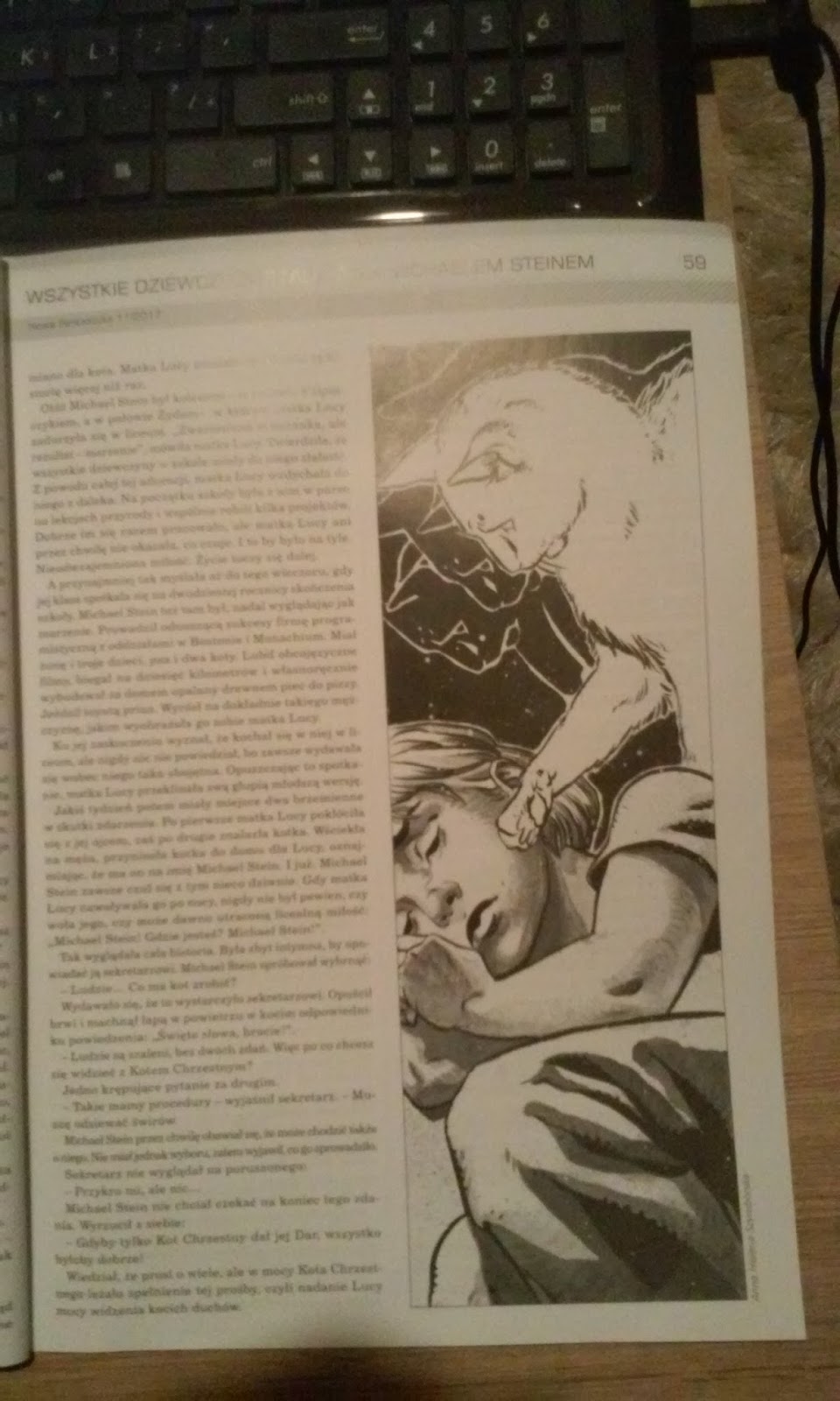Dział prozy zagranicznej otwiera "Wezwanie" Jima Butchera, opowiadające o jednej z przygód Harry'ego Dresdena. I właśnie ta próbka twórczości autora, w połączeniu ze wcześniejszym artykułem sprawiły, że postanowiłam przeczytać chociaż kilka książek z tej serii. "Zaraza" Ken Liu była krótkim, ale niezwykle przejmującym tekstem o zagładzie i jej konsekwencjach. Z kolei "Rozczarowujące opowiadanie" Roberta Shearmana wydaje się być wynikiem niezwykle ciekawego zabiegu literackiego i założenia, że rozczarowanie jest pożądanym uczuciem. Lekki i niezwykle przyjemny tekst cieszy nietypowymi pomysłami i prostotą, która w żadnym miejscu nie nudzi. Jednak zdecydowanie najfajniejszym opowiadaniem numeru jest dla mnie "Wszystkie dziewczyny szaleją za Michaelem Steinem". Tak, ponieważ było o kotach. A w zasadzie o kocich duchach. I o dziewczynce, która miałaby zostać ich detektywem. Bardzo chętnie przeczytałabym całą serię o jej przygodach i mam nadzieję, że takowa powstanie.